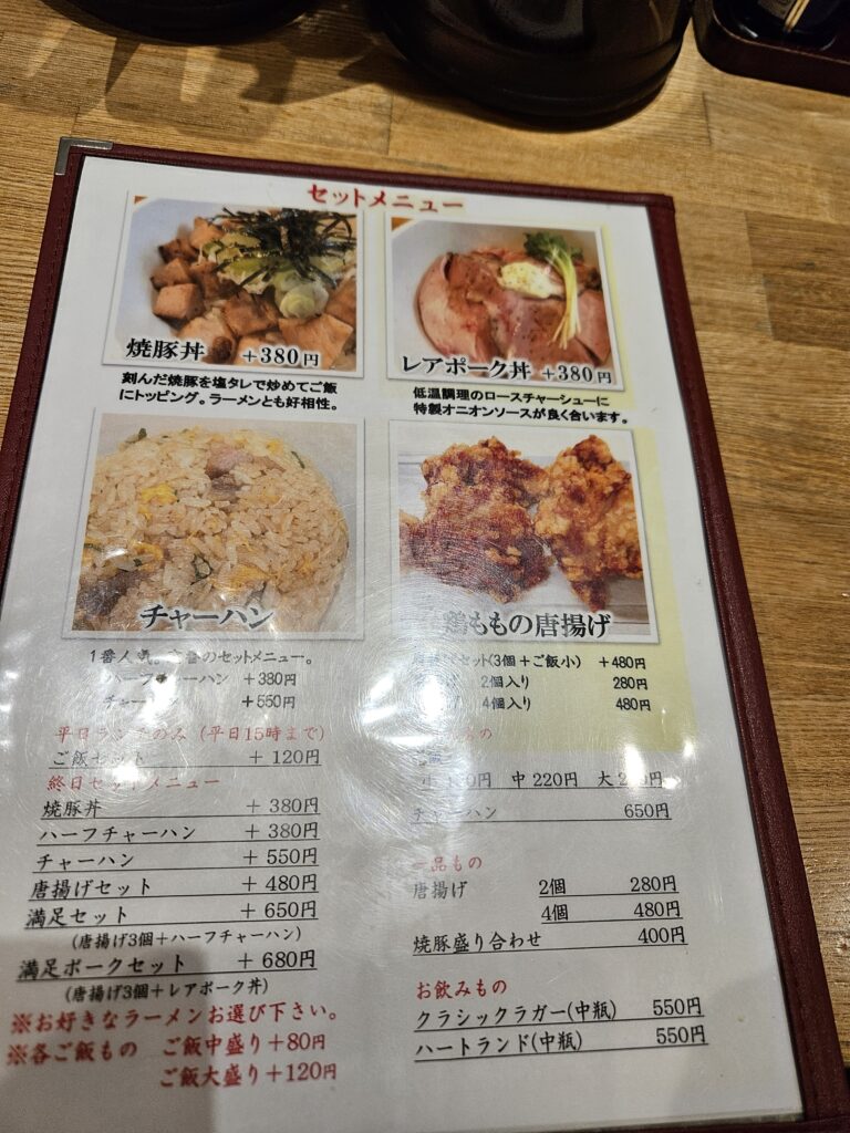 鶏ももの唐揚げは高温でパリッと焼き上げる。噛むと肉汁がじゅわりと溢れ出し、ビールのお供にもぴったりだ。ご飯ものの「レアポーク丼」は、特製オニオンソースが乗り、ラーメンの合間に勢いよくかき込みたくなる。