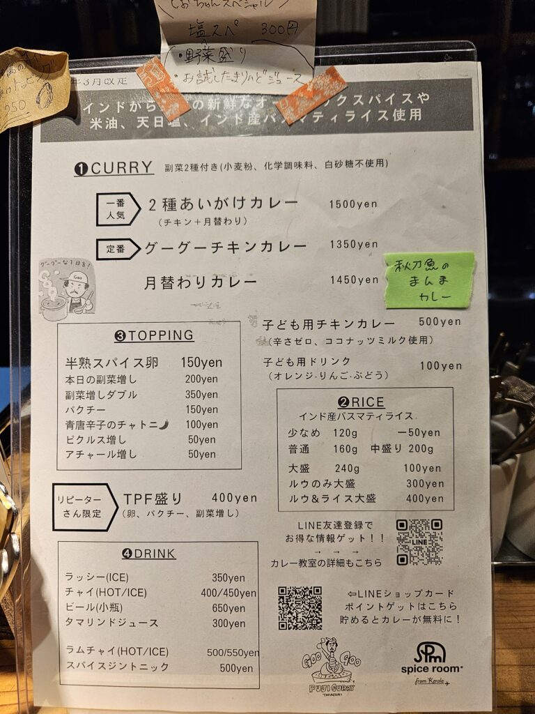 夜はランチで人気のメニューに加え、スパイスたっぷりの豆カレーや季節の魚を使ったカレープレートも登場。混ぜ合わせるほどにスパイス同士が響き合い、ひと口ごとに顔がほころぶ楽しさがクセになる。カウンターでちょっと一杯、テーブルでしっかり宴会、どちらの利用でも“スパイスのパフォーマンス”が存分に味わえるのがグーグー藤カレーの真骨頂だ。