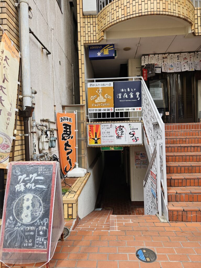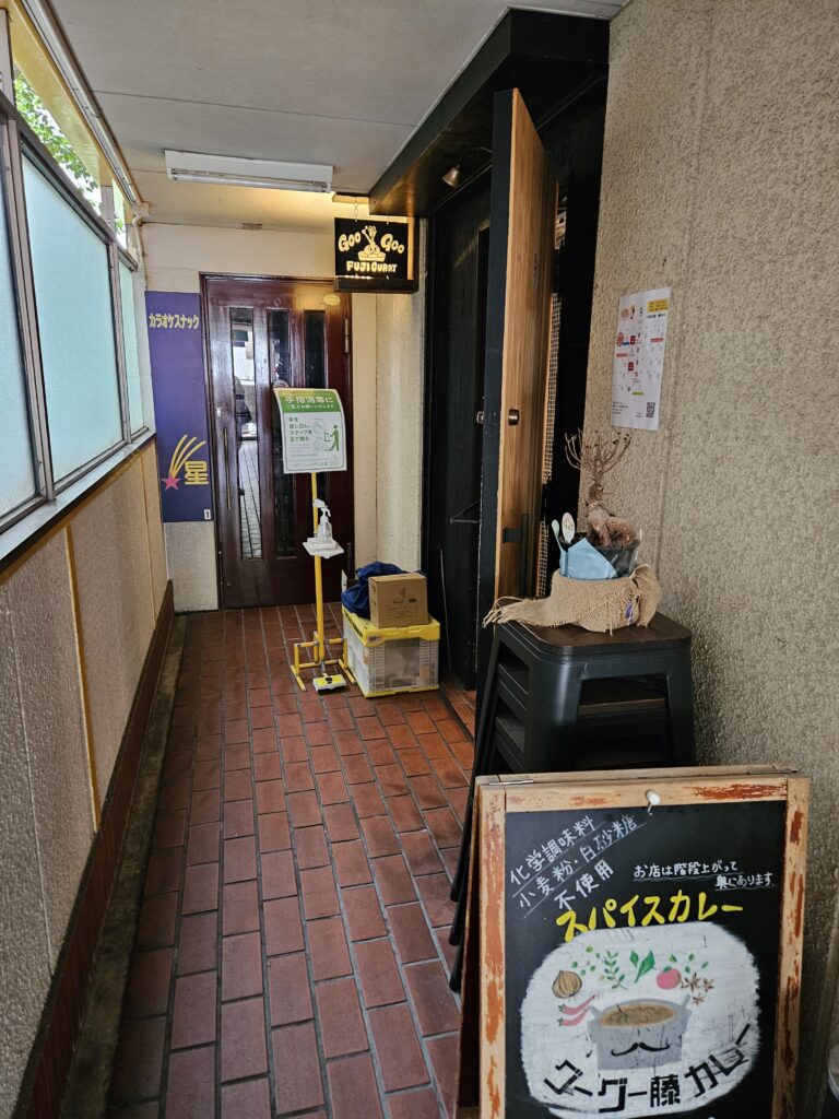 グーグー藤カレーは、JR高槻駅南口からわずか徒歩3分の路地裏にひっそり佇む“おとなのスパイス酒場”。こぢんまりとした階段を上がり扉を開けると、スパイスの香りとカレー作りのライブ感が出迎えてくれる。2階建ての店内は1階がカウンター6席、奥にテーブル2卓。少人数ならカウンター越しに店主との会話も楽しめ、グループ利用でもしっかりと隠れ家感を味わえる。