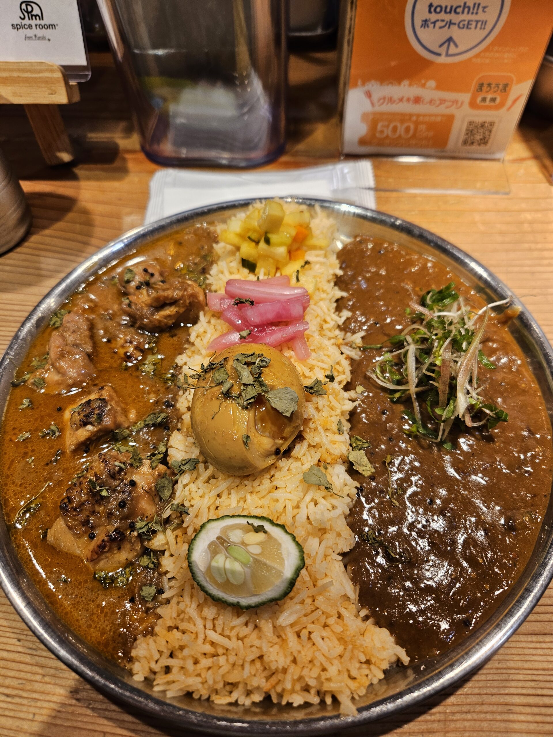 トッピングの半熟スパイス卵(+150円)は、マドラス風タマリンドとクミンのソースに漬け込んだ絶品。箸を入れると黄身がとろりと溶け出し、カレーソースにまろやかなコクをプラスする。副菜には自家製ピクルスやシャキシャキ野菜の炒め物が付き、辛味と酸味のリズムが食欲を加速させる。