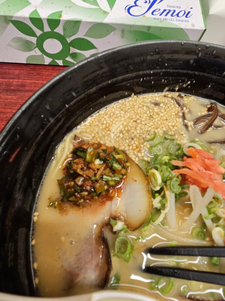 スープは鶏ガラと豚骨をじっくり炊いたベースに、角のないまろやかな甘みがあるのが特徴。長浜系らしい細ストレート麺がスープによく絡み、麺の食感とスープのバランスが良い一杯に仕上がっています。